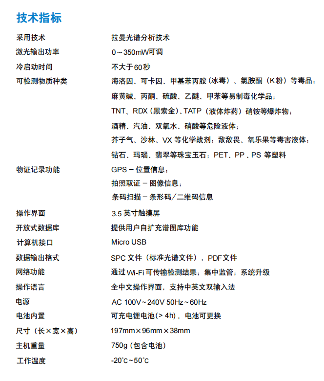簡介:手持式化學(xué)物質(zhì)識別儀,是一款利用拉曼光譜分析技術(shù)(Raman Spectroscopy Technology)進(jìn)行物質(zhì)識別的設(shè)備,可以廣泛應(yīng)用于海關(guān)、邊防、公安、法院等,進(jìn)行化學(xué)物質(zhì)的識別和鑒定。